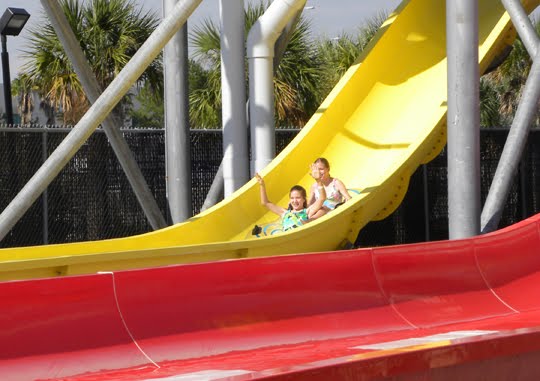 The red and white slide was the biggest thrill. Raeg got me to go down this one. It shoots you down a slide and then up a ramp similar to a skate board ramp. Then back down again and through a mini waterfall. so much fun.